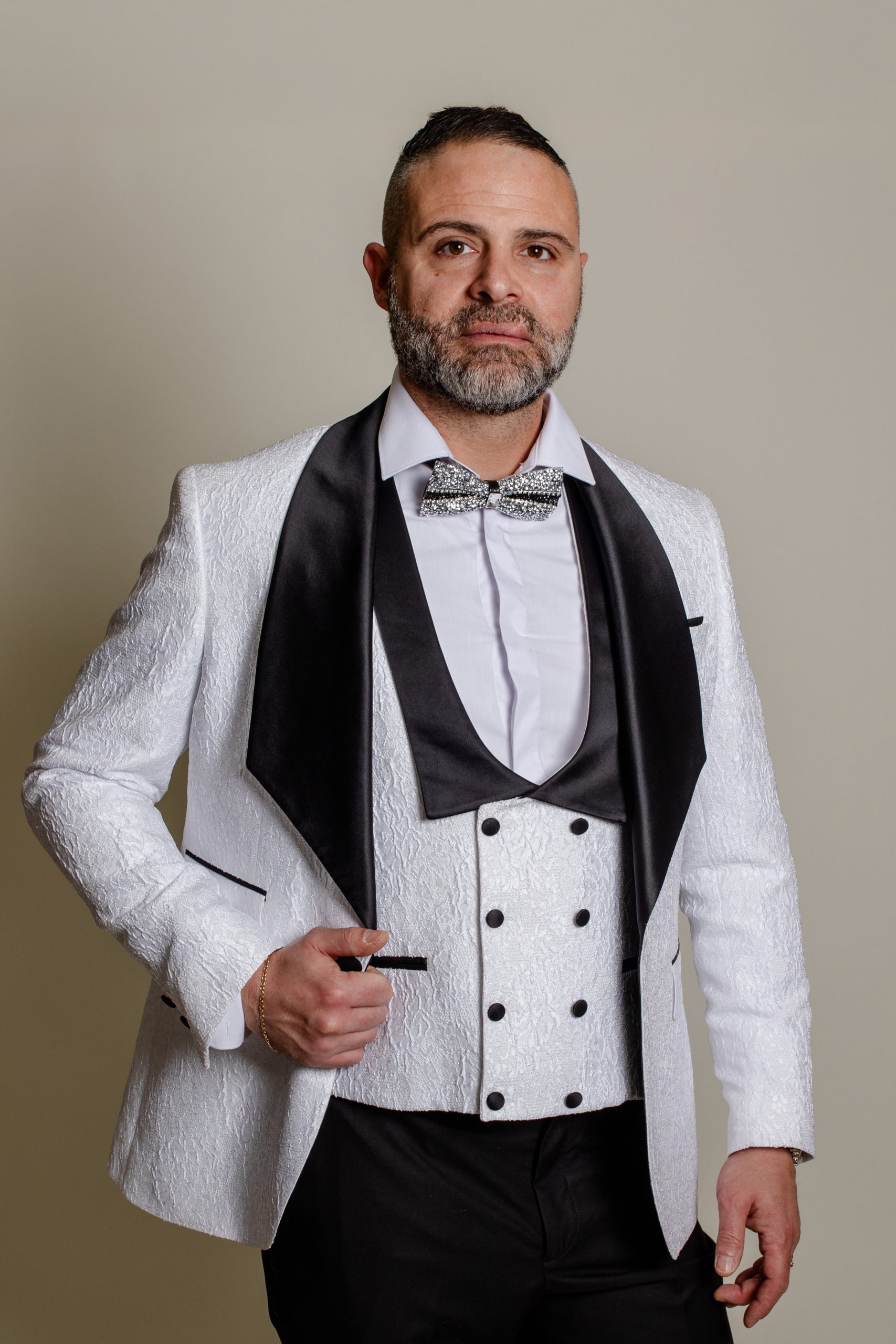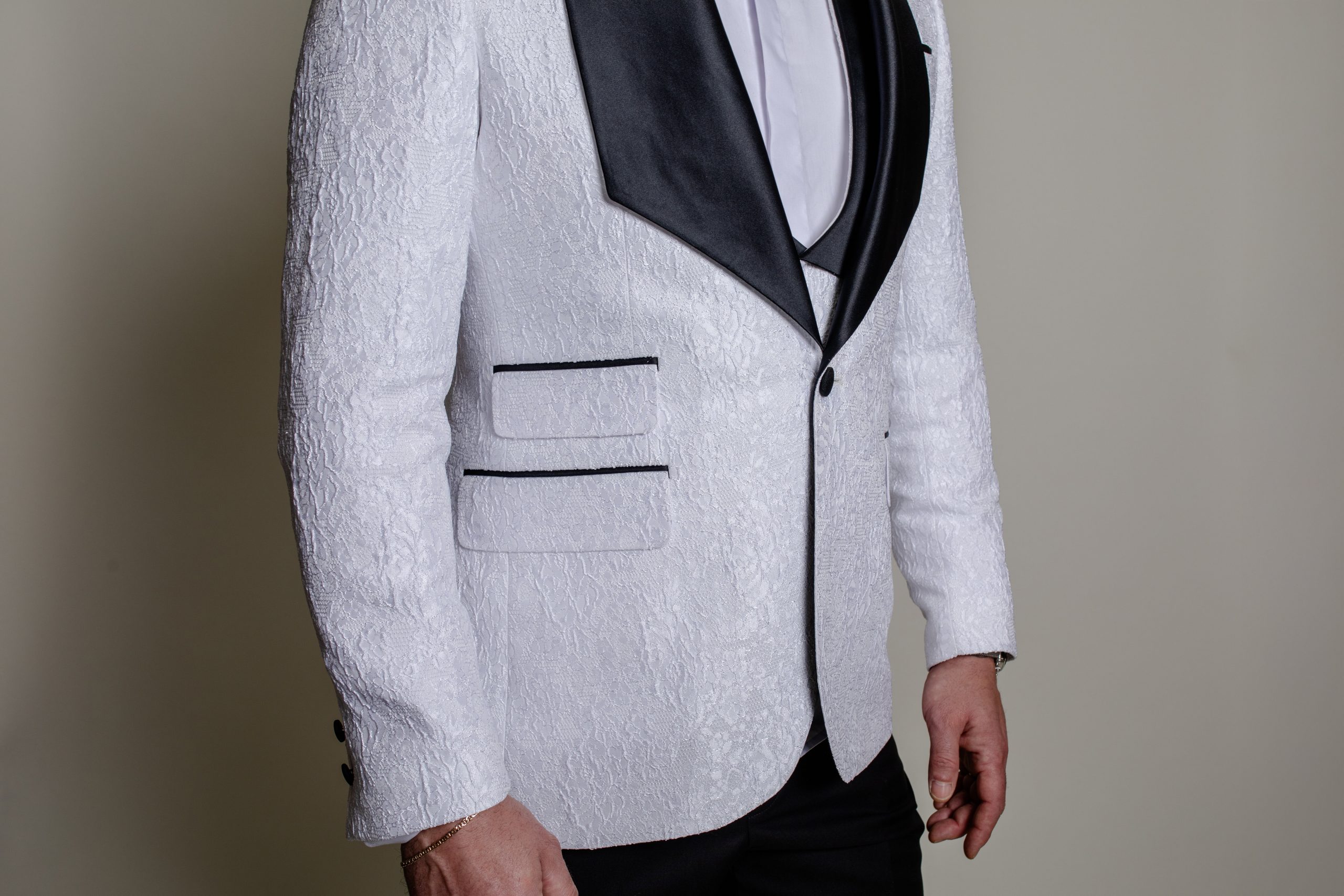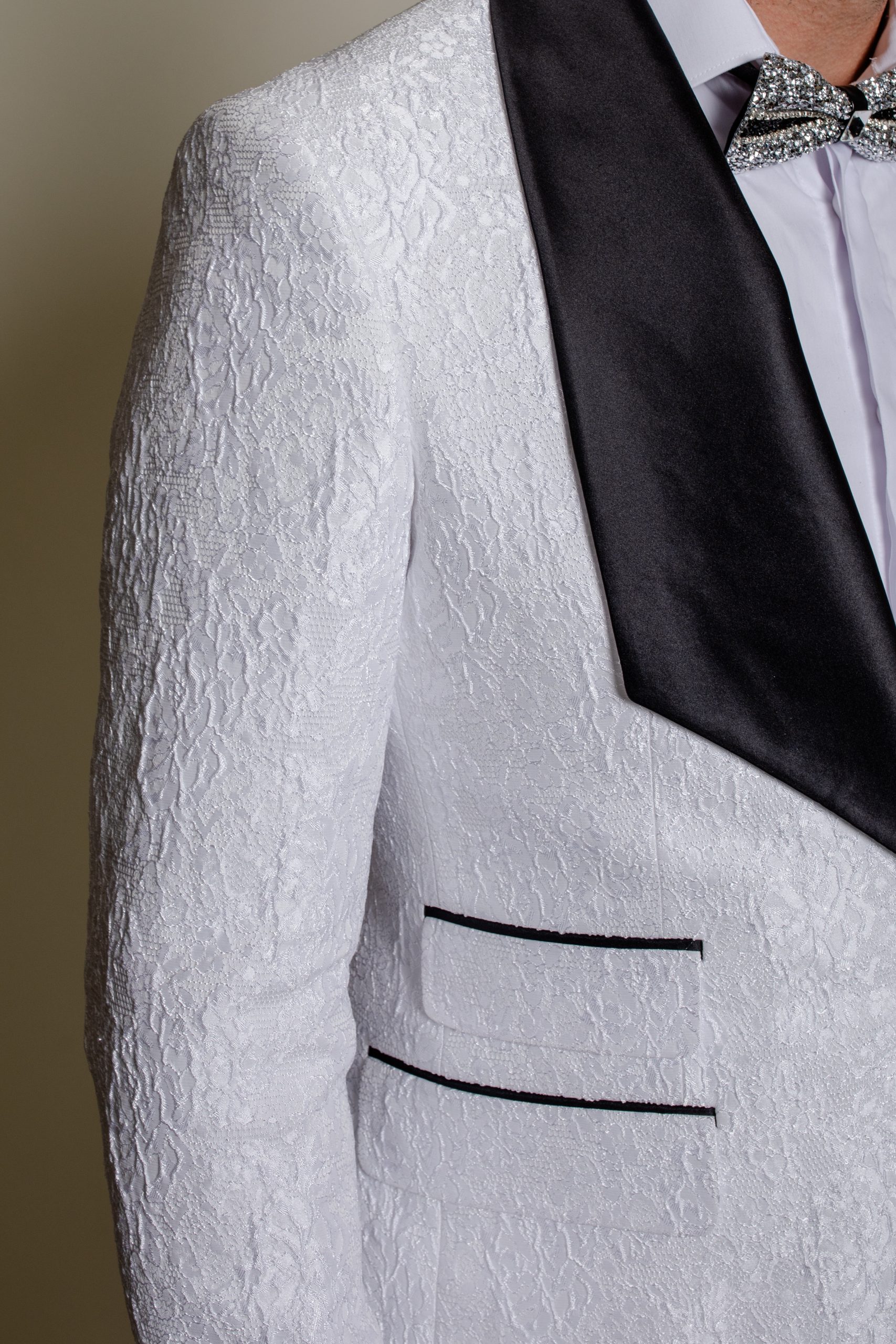 L’EDEN est bien plus qu’un costume, c’est un déclaration d’élégance et d’originalité. Le costume 3 pièces en dentelle blanche, allie luxe, raffinement et modernité.