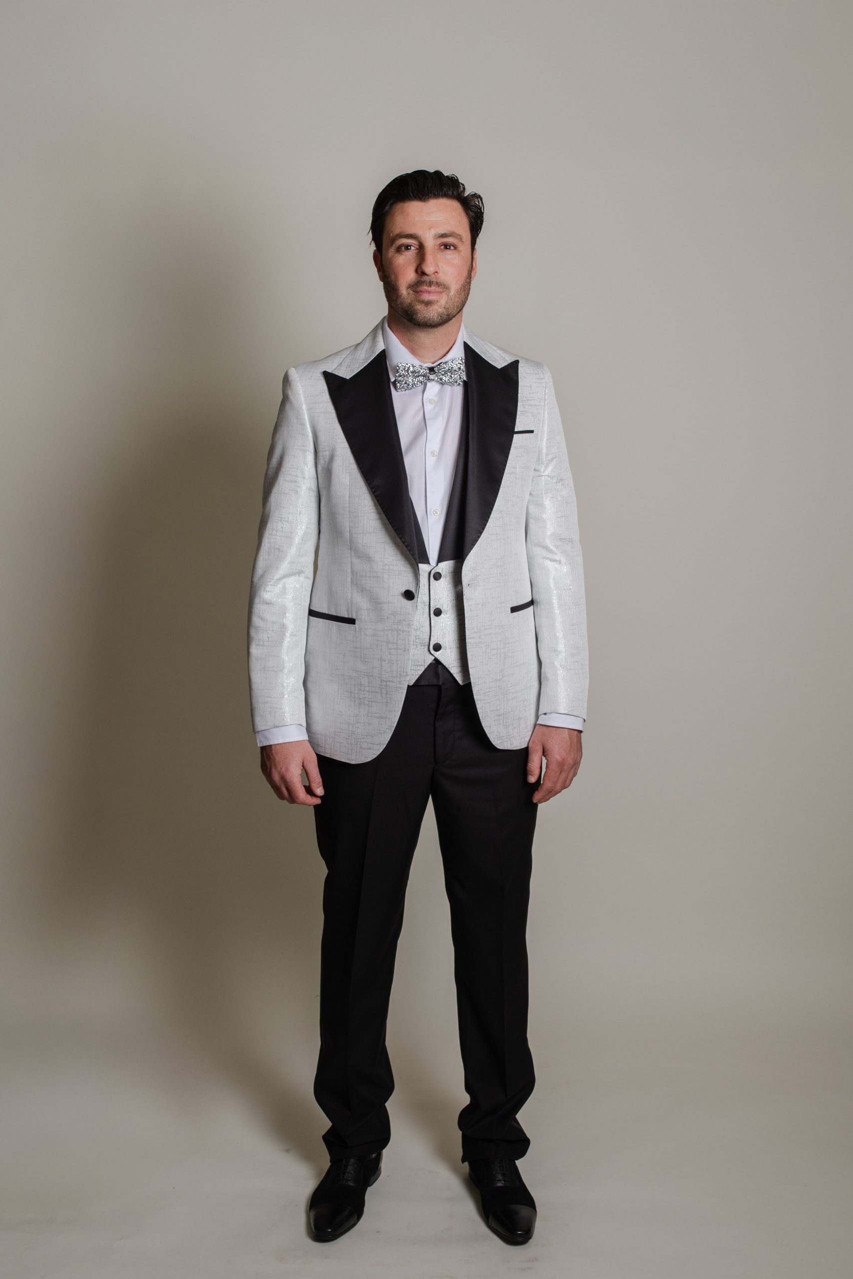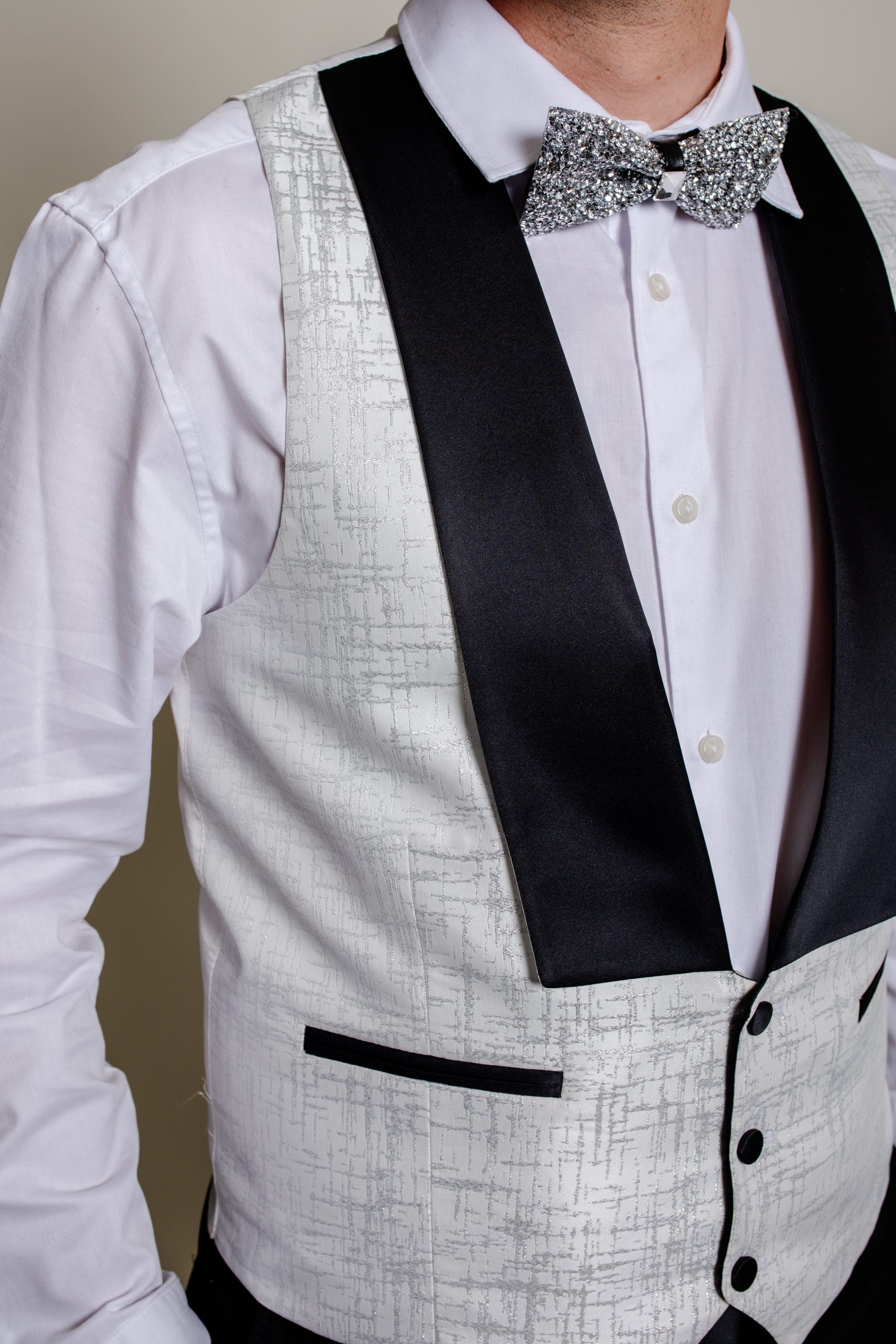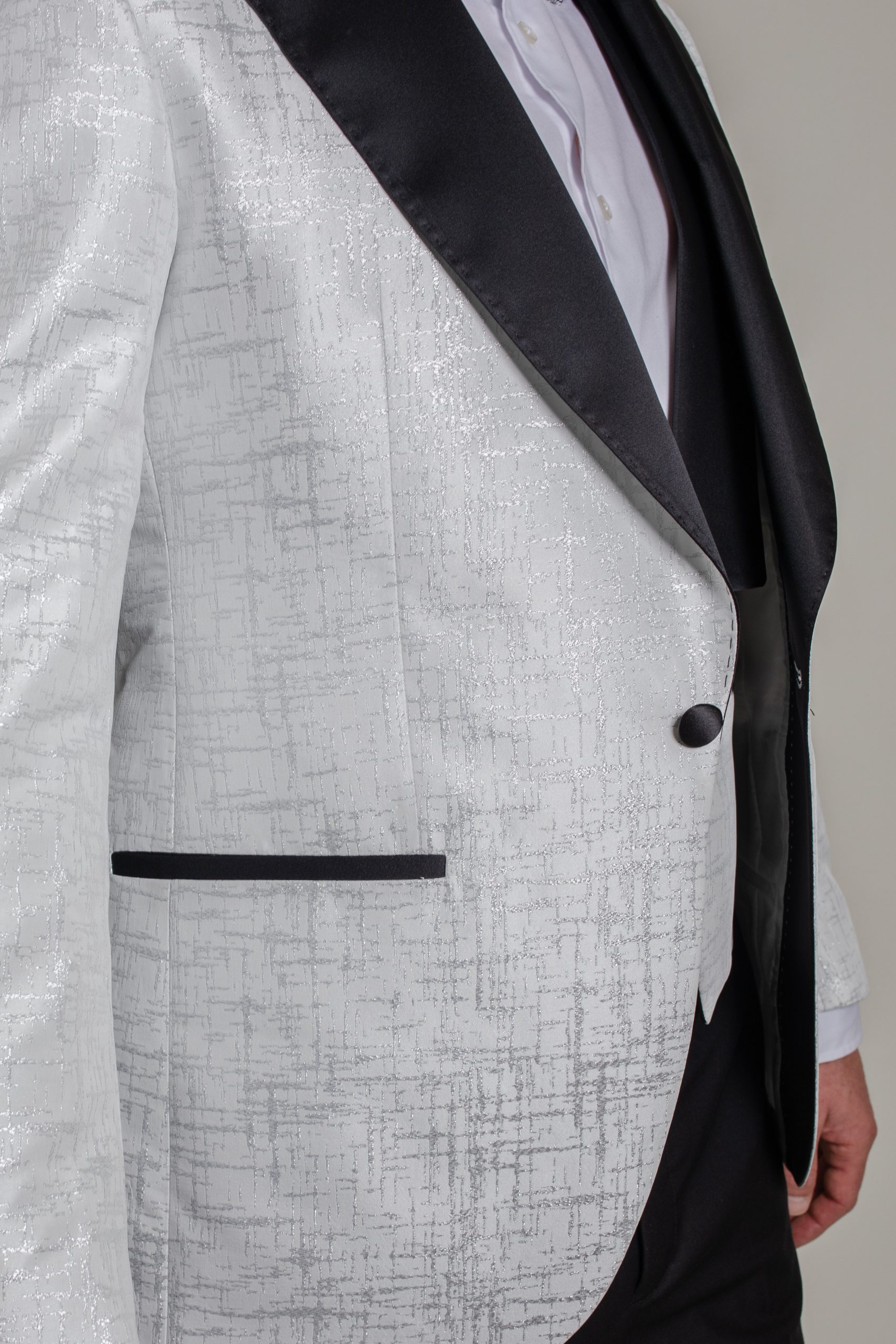 Son tissu blanc satiné, subtilement rehaussé de fils argentés lumineux, capte la lumière et offre une prestance exceptionnelle au marié.