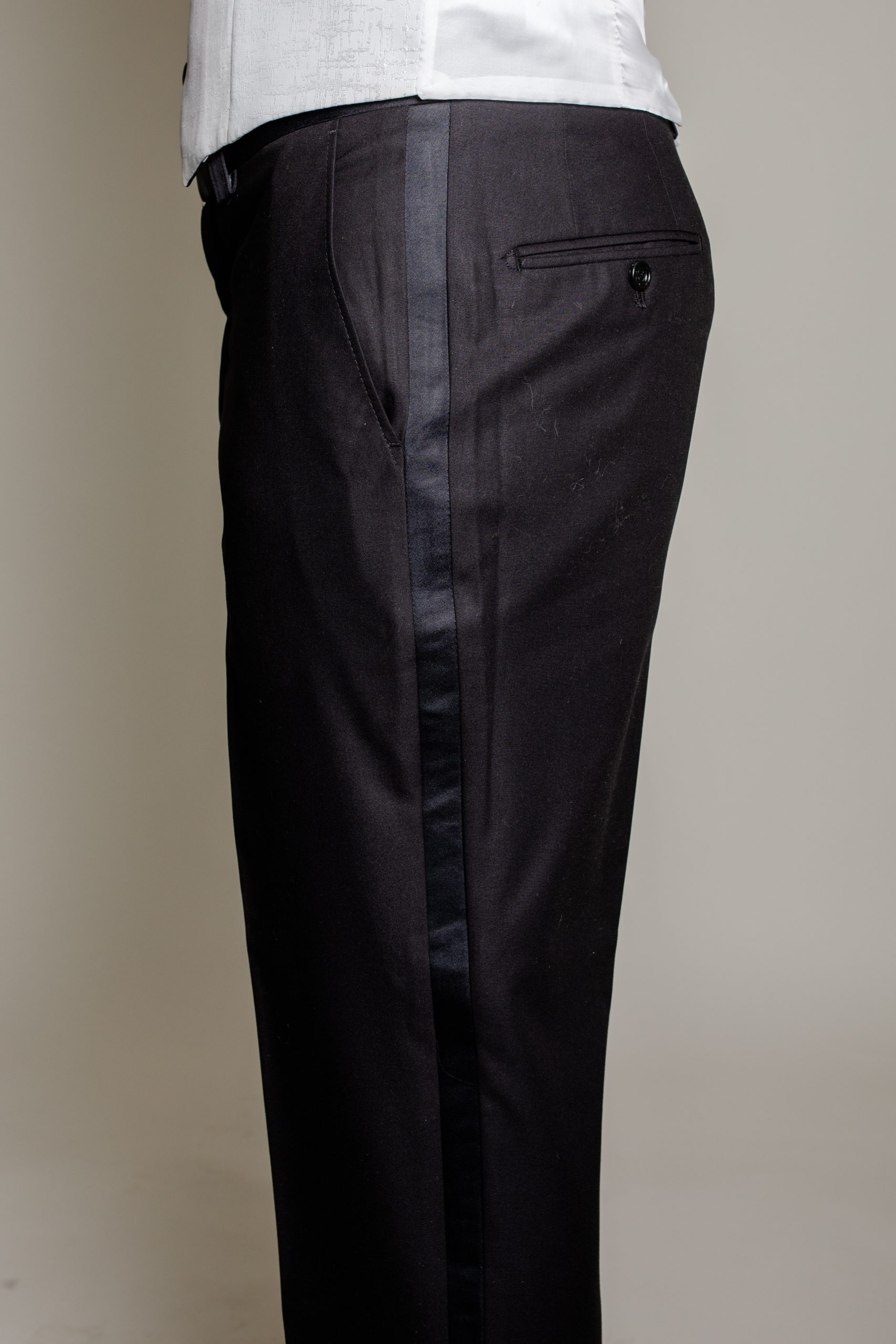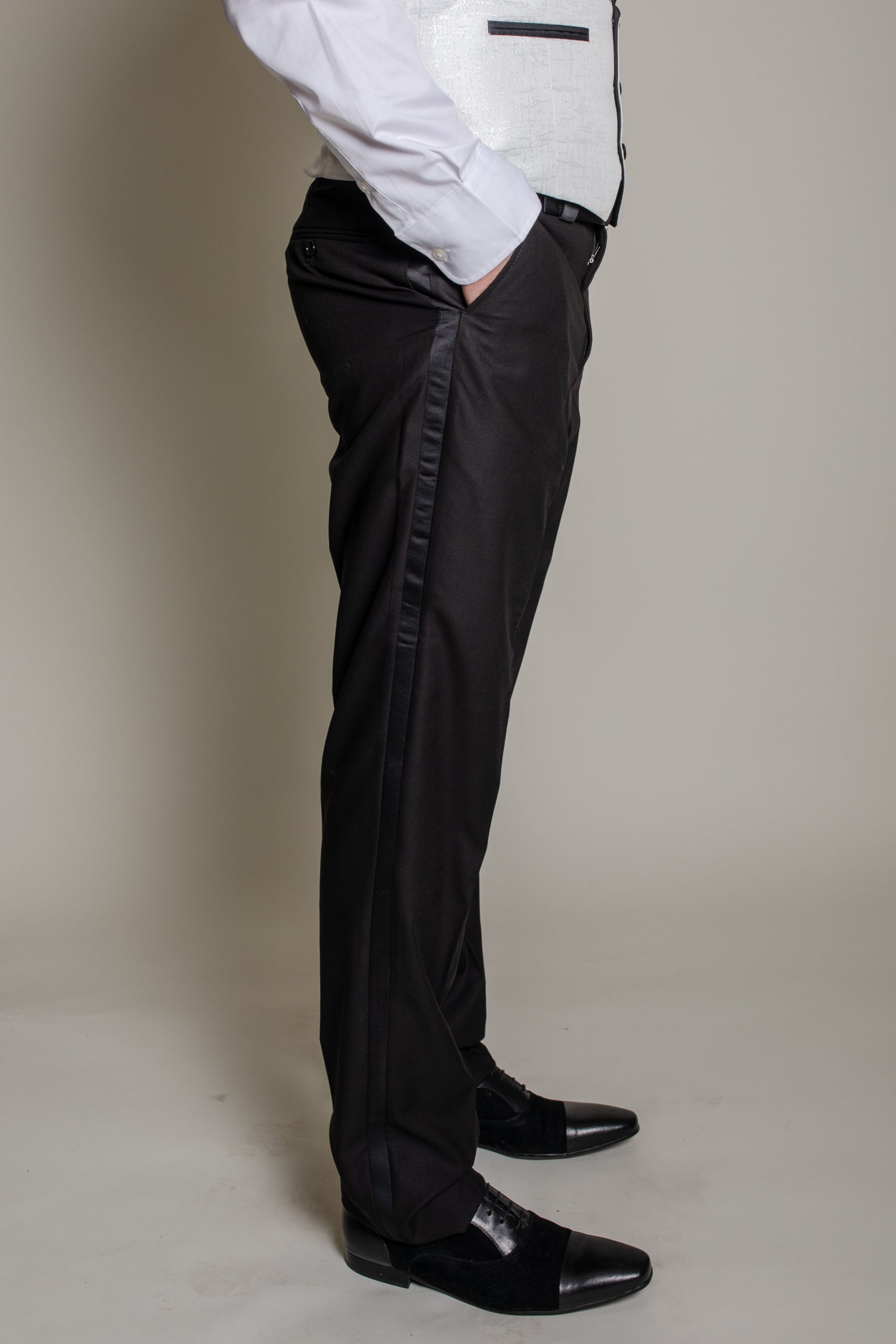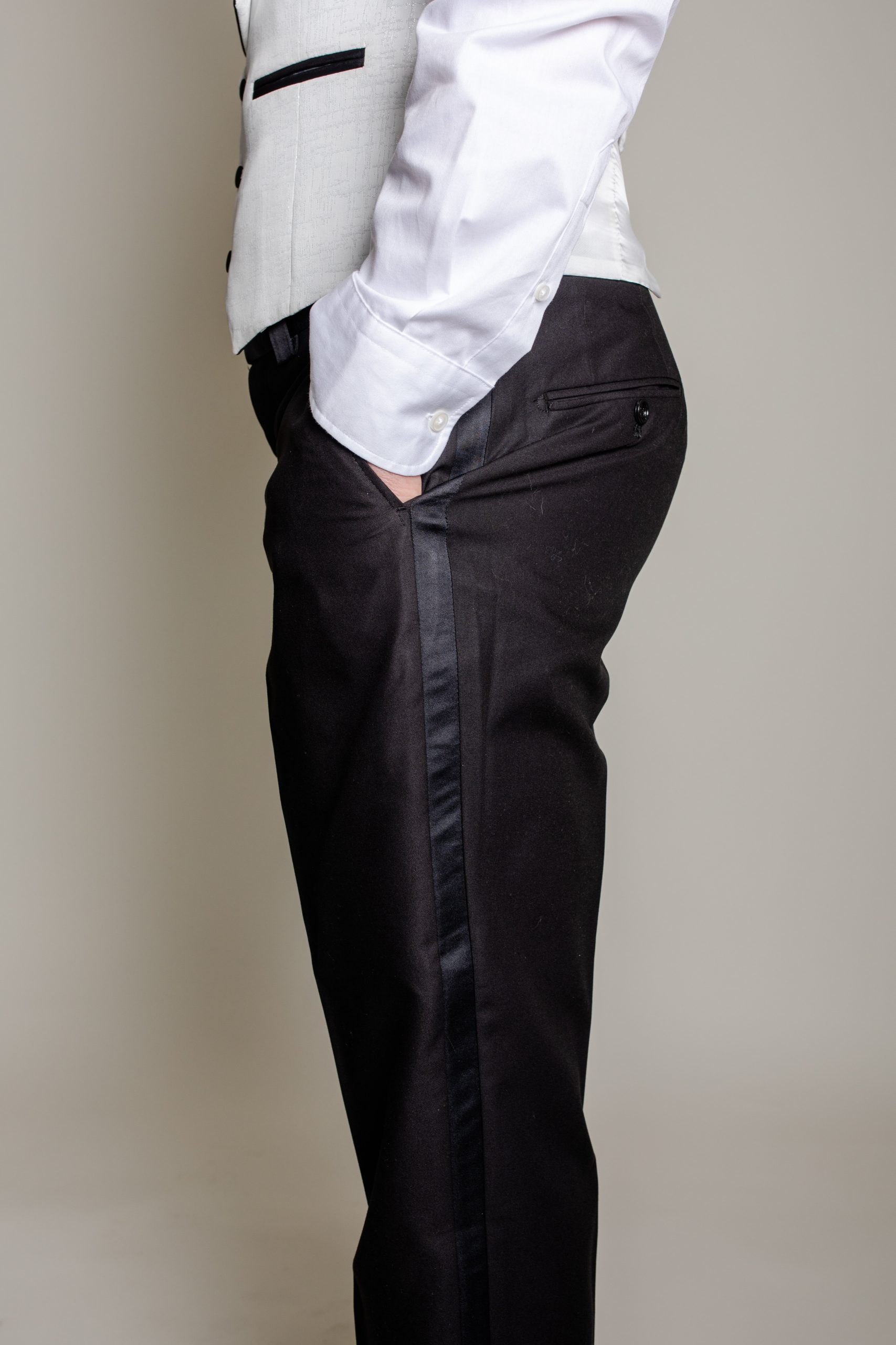 Pantalon confortable : conçu pour allier style et aisance, il intègre une bande satinée sur le côté, rappel subtil des détails de la veste.
