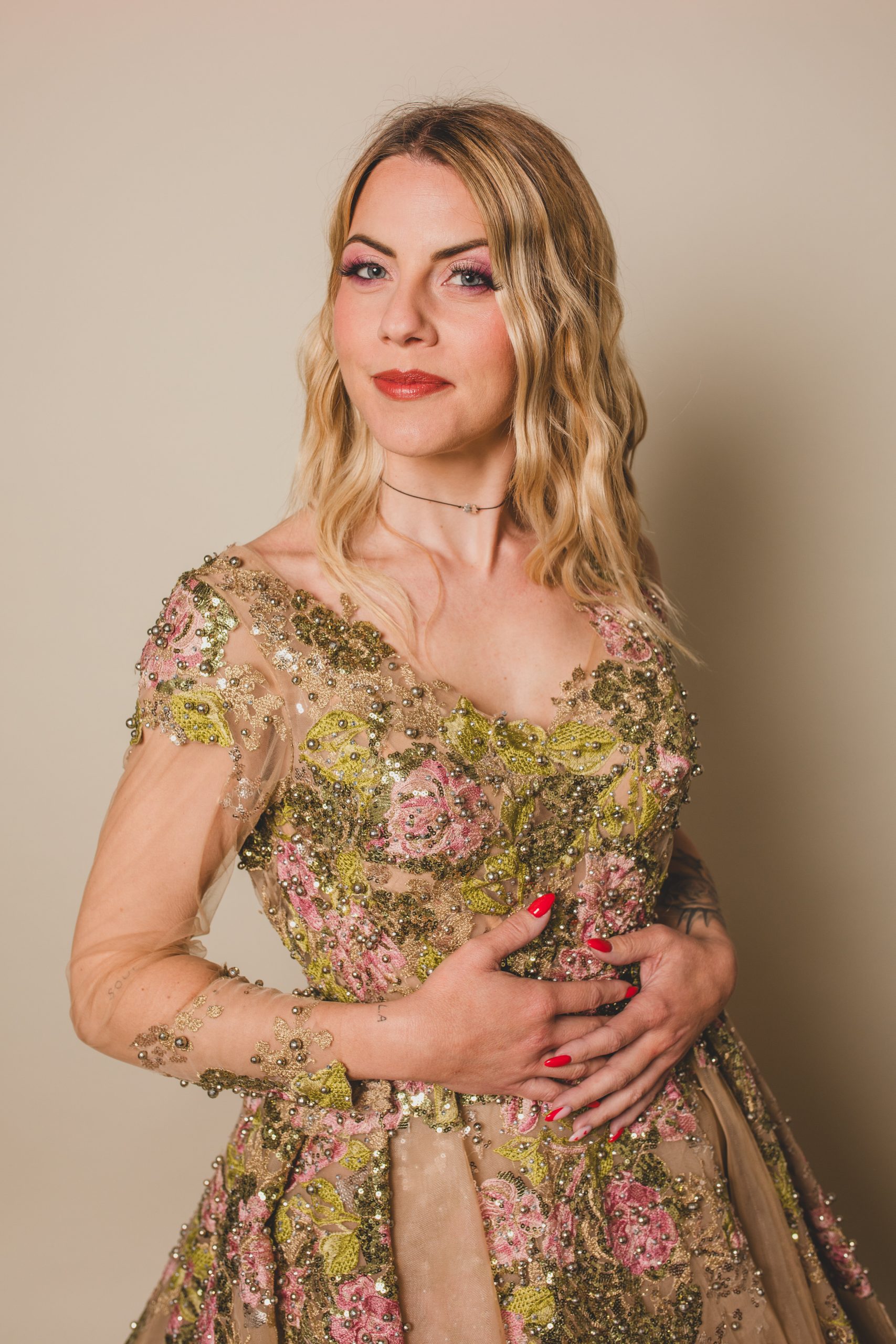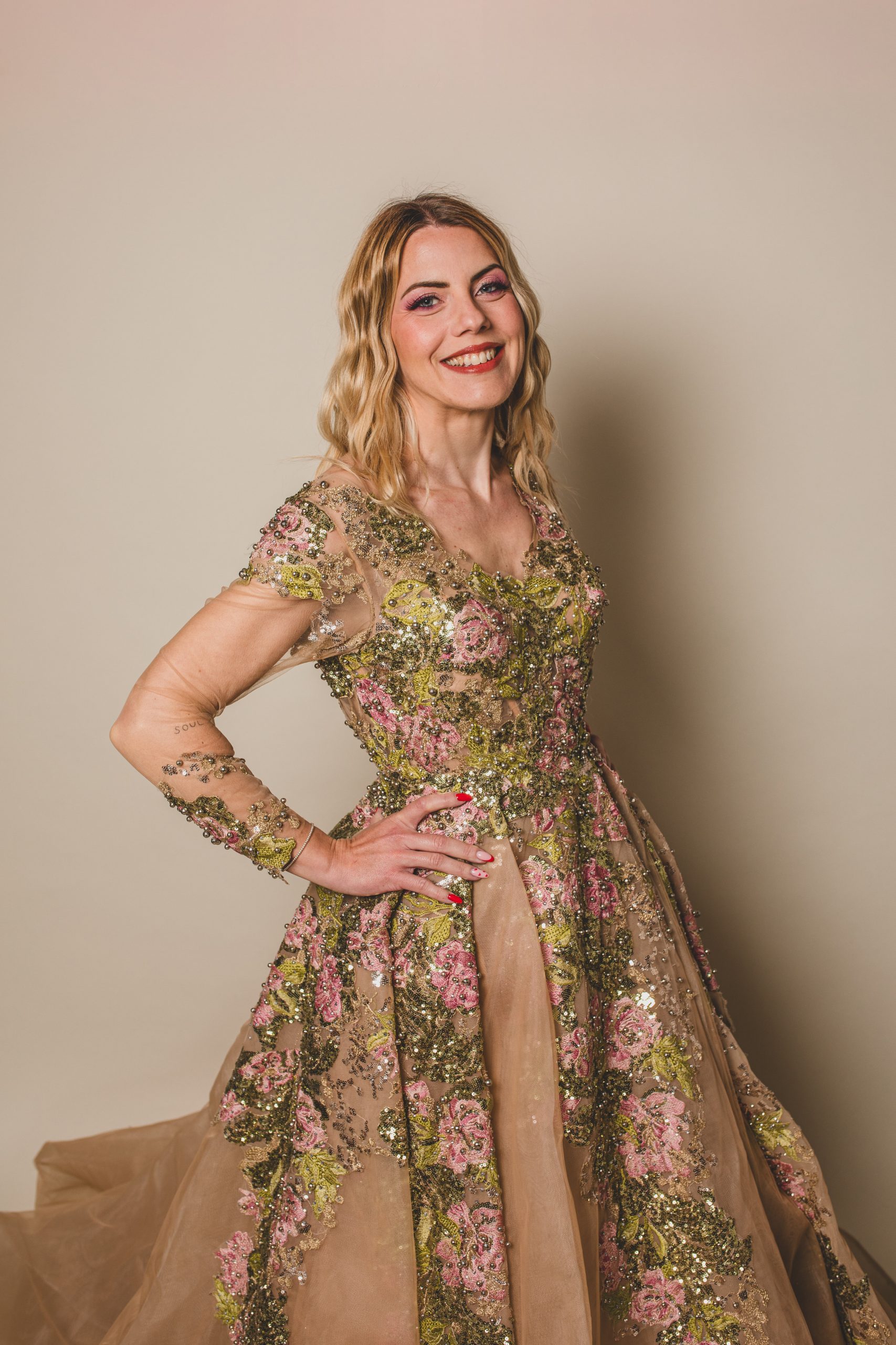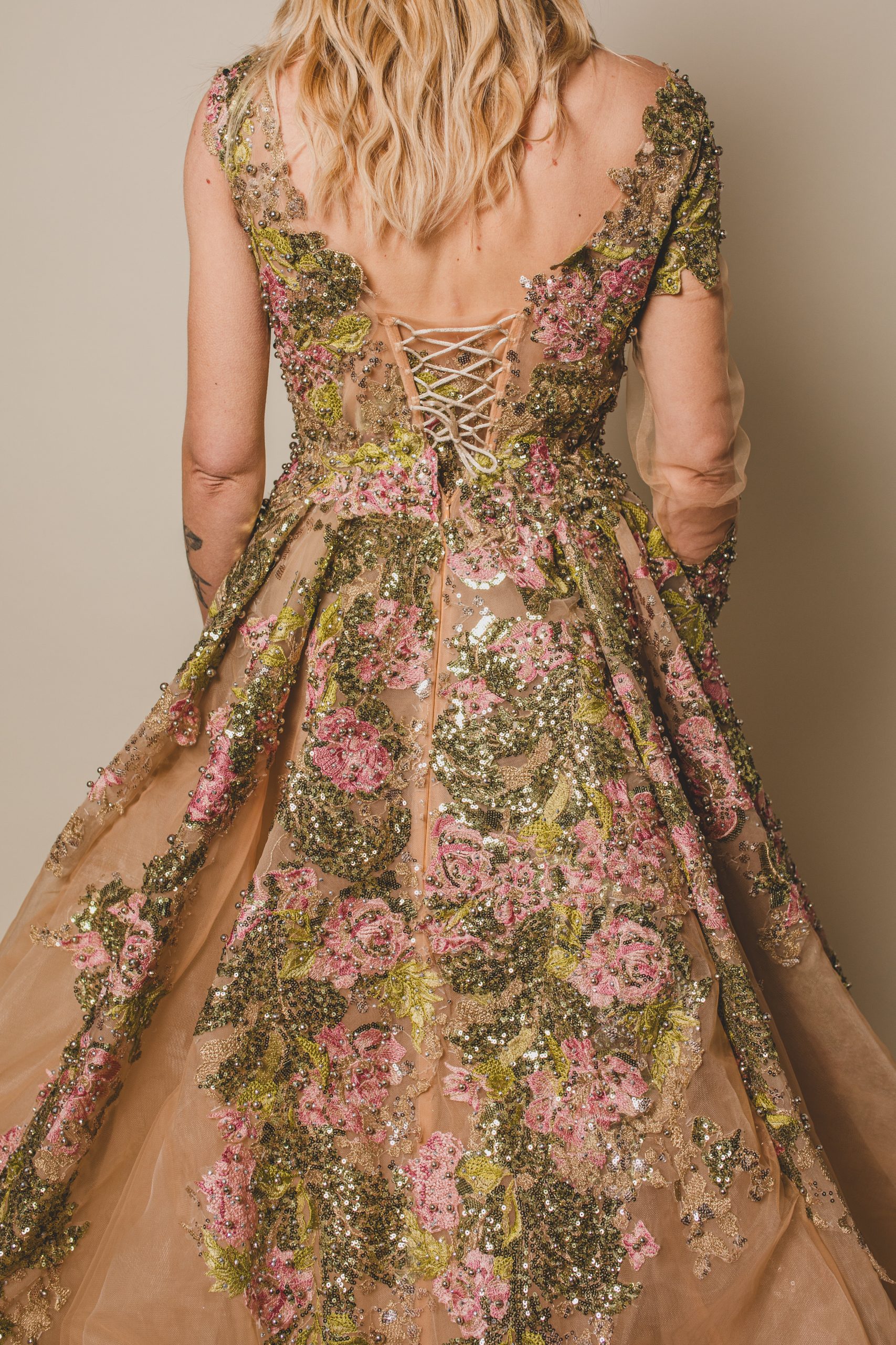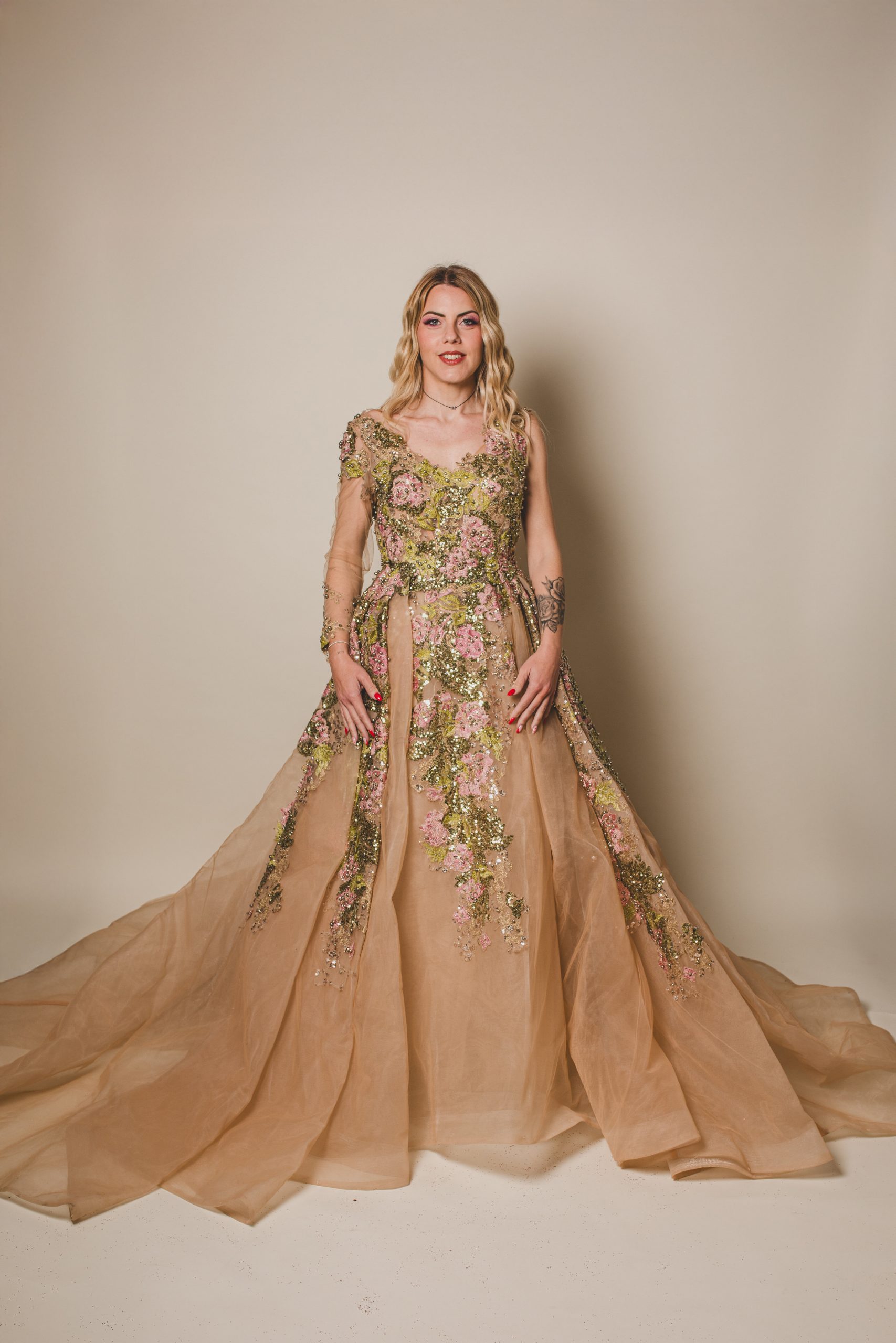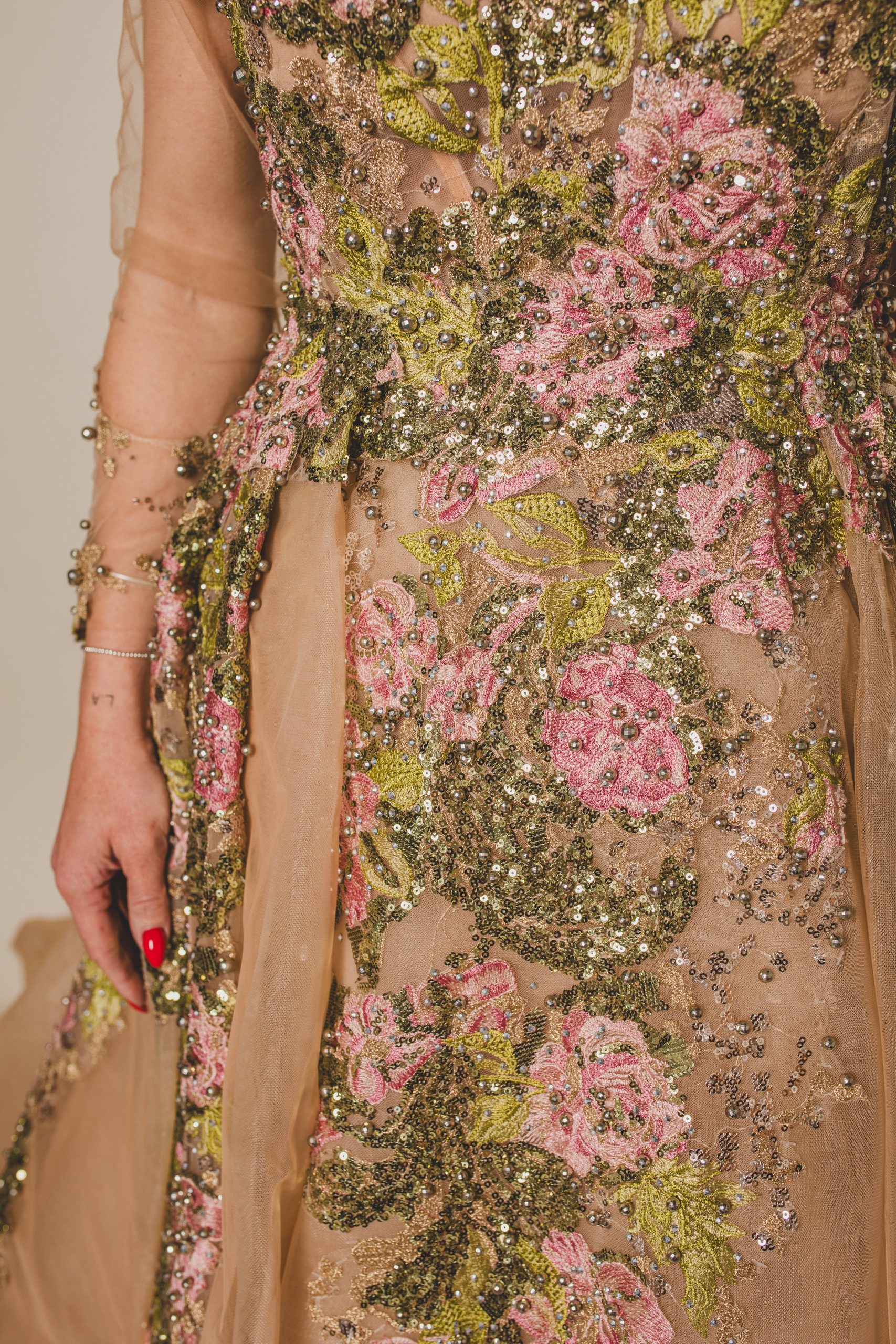 Cette robe en tulle couleur peau est ornée de broderies, strass et perles qui évoquent un jardin féerique, avec des feuilles vertes scintillantes et des roses roses éclatantes.