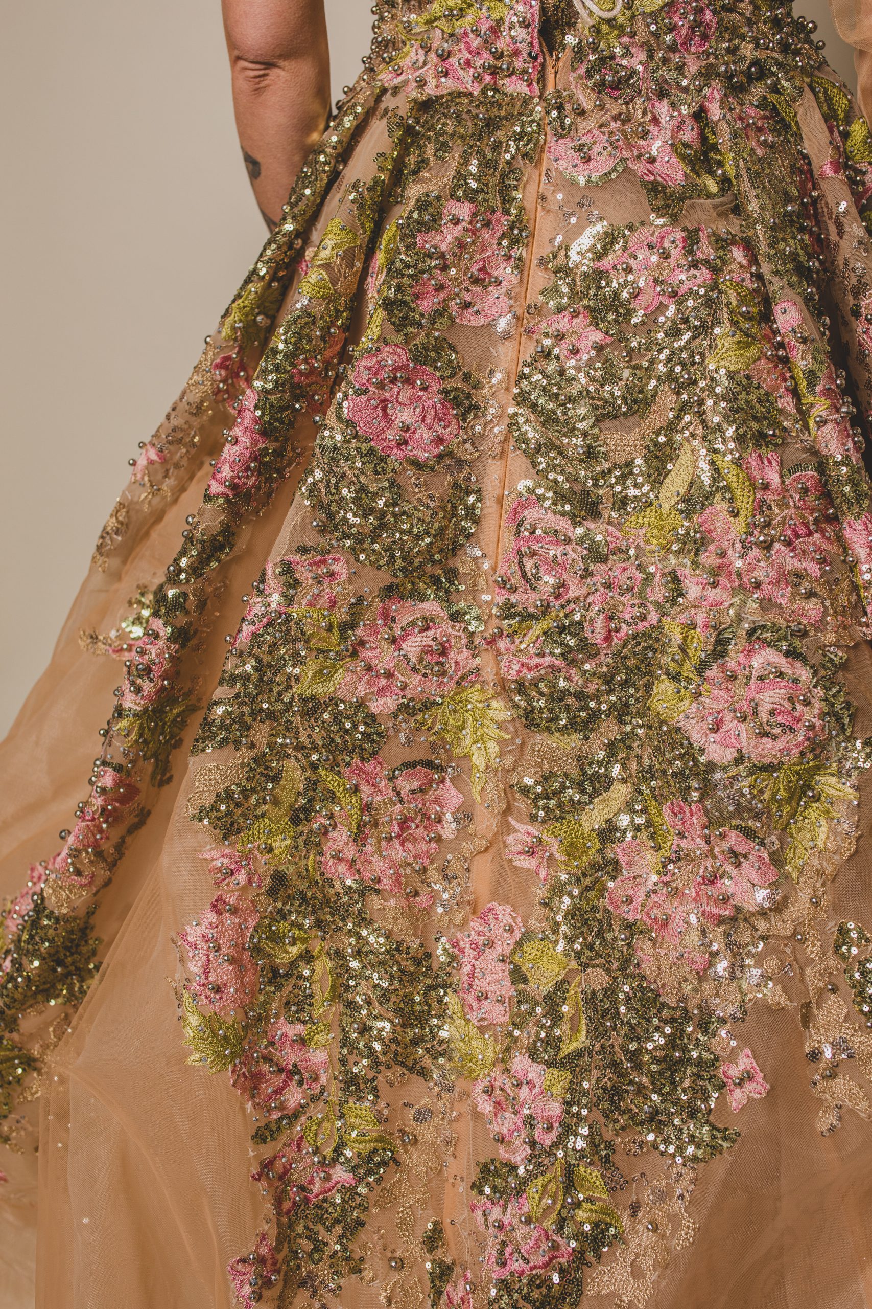 La jupe en tulle couleur peau est entièrement brodée de motifs floraux et feuillus, captant la lumière à chaque mouvement.
