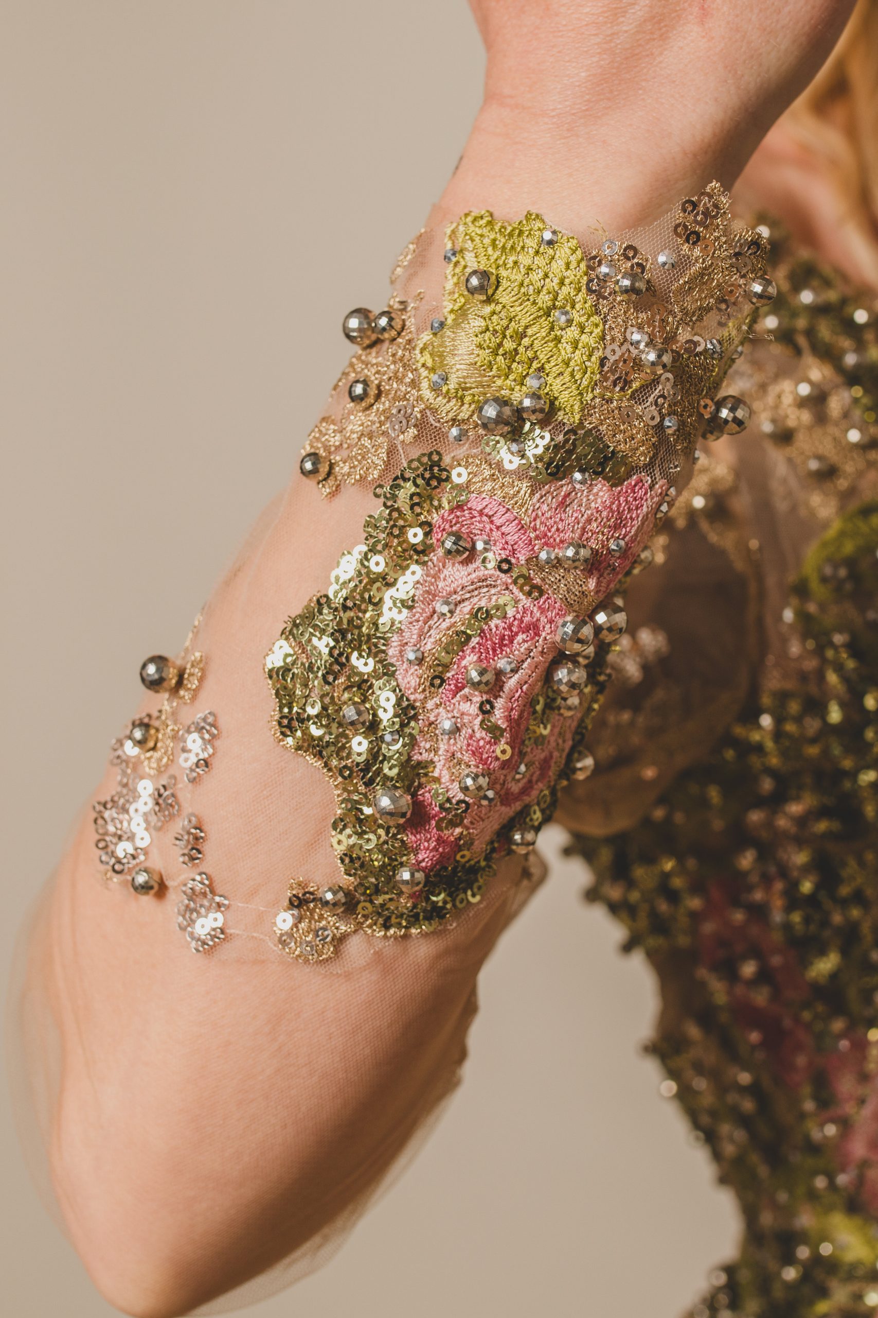 - Une manche en tulle brodé, avec des broderies densifiées au niveau des poignets pour une asymétrie parfaite