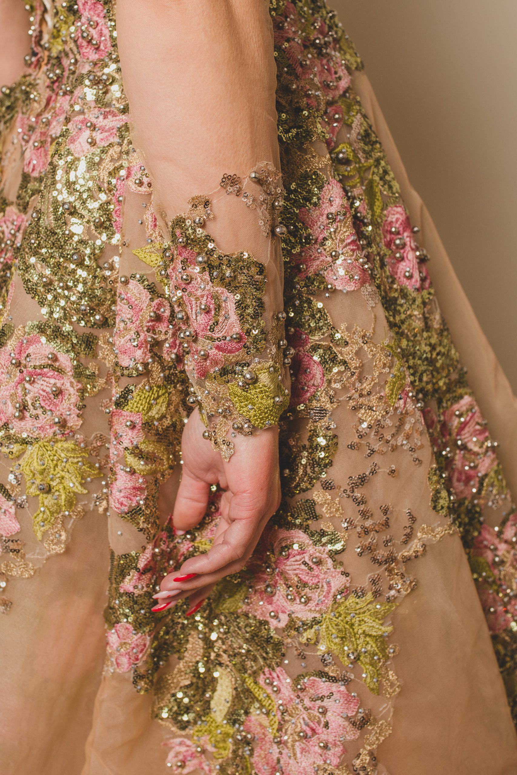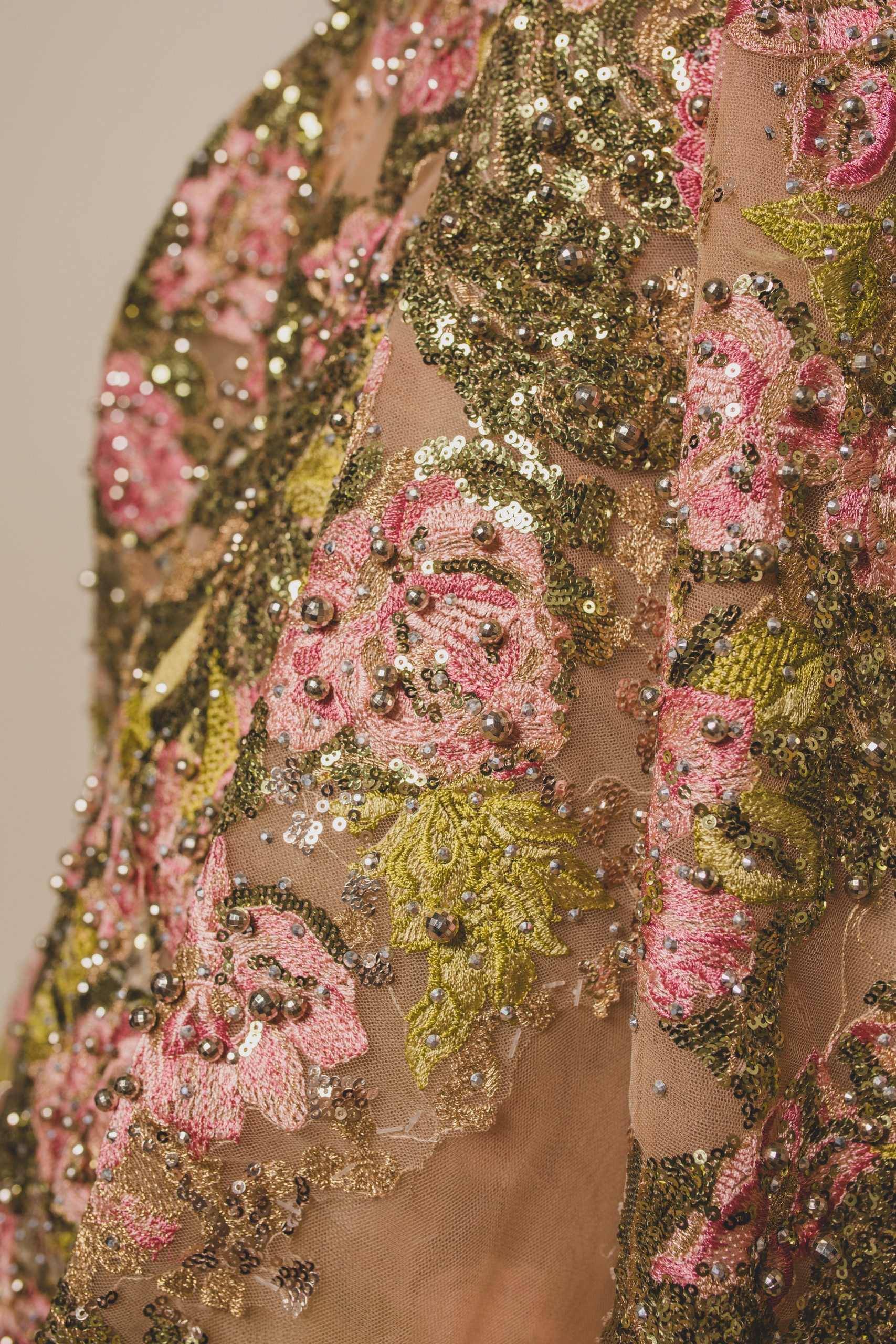 Les broderies, strass et perles vertes en forme de feuilles apportent une touche naturelle, tandis que les roses roses ajoutent une dimension florale et féminine.